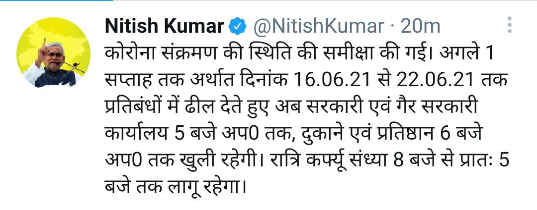 मुख्यमंत्री नीतीश कुमार ने थोड़ी देर पहले ट्वीट करते हुए बताया है कि एक हफ्ते के लिए बिहार में पहले से ज्यादा छूट के साथ अनलॉक 2 जारी रहेगा. बिहार में 16 से 22 जून तक प्रतिबंधों में ढील दी गई है. अब सरकारी और निजी ऑफिस शाम 5 बजे तक खुलेंगे. पहले इन्हें 4 बजे तक खोलने का आदेश दिया गया था. दुकानें और अन्य तरह के प्रतिष्ठान शाम 6 बजे तक खुल पाएंगे. पहले 5 बजे तक बाजार खोलने की छूट थी.