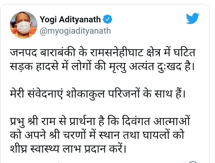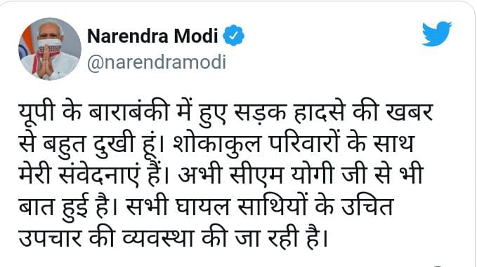 प्रधानमंत्री ने ट्वीट कर कहा कि वे इस हादसे से काफी दुखी हैं। उन्होंने बताया कि घटना की जानकारी मिलने के बाद उत्तर प्रदेश के मुख्य मंत्री योगी आदित्य नाथ से उन्होंने बात की है। उन्होंने सभी मृतकों के शोकाकुल परिवार के प्रति संवेदना जताई है। साथ ही सभी घायलों के उचित उपचार का भरोसा दिलाया है।