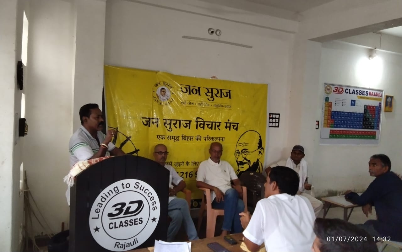 विचार गोष्ठी को संबोधित करते हुए रमाशंकर उर्फ गप्पू सिंह ने कहा कि प्रशांत किशोर जिस भावना के साथ बिहार की समस्याओं को लेकर निकले हैं इसके समाधान के लिए हमें उनके कदम से कदम मिलाकर चलना होगा। यही इसके समाधान का बेहतर तरीका है। कार्यक्रम को मथुरासिनी इंटर कॉलेज के पूर्व प्रधानाचार्य आनंद देव पांडेय ने भी संबोधित किया। इन्होंने कहा कि बिहार इन दिनों शैक्षणिक अराजकता से गुजर रहा है। इससे निपटने के लिए छात्रों को आंदोलित होने की जरूरत है।तभी बिहार के हर क्षेत्र में बदलाव संभव है।कार्यक्रम की शुरुआत जन सुराज के जिला मीडिया प्रभारी व जन सुराज विचार मंच के जिला संयोजक अजय कुमार की देखरेख में हुई। इसकी अध्यक्षता प्रखर समाजवादी अजय शरण ने की। कार्यक्रम में दर्जनों की संख्या में उपस्थित पुरुष व महिलाओं ने जन सुराज के प्रणेता प्रशांत किशोर के बारे में दी गई जानकारी को सुना और जनसुरज के उद्देश्यों व समाज के कल्याणकारी कार्यों में जन चेतना को जागृत करने जैसे कार्यों की सराहना की। इस दौरान पत्रकार अशोक राय ने जन सुराज के उद्देश्यों के बारे में लोगों को बताया गया है।