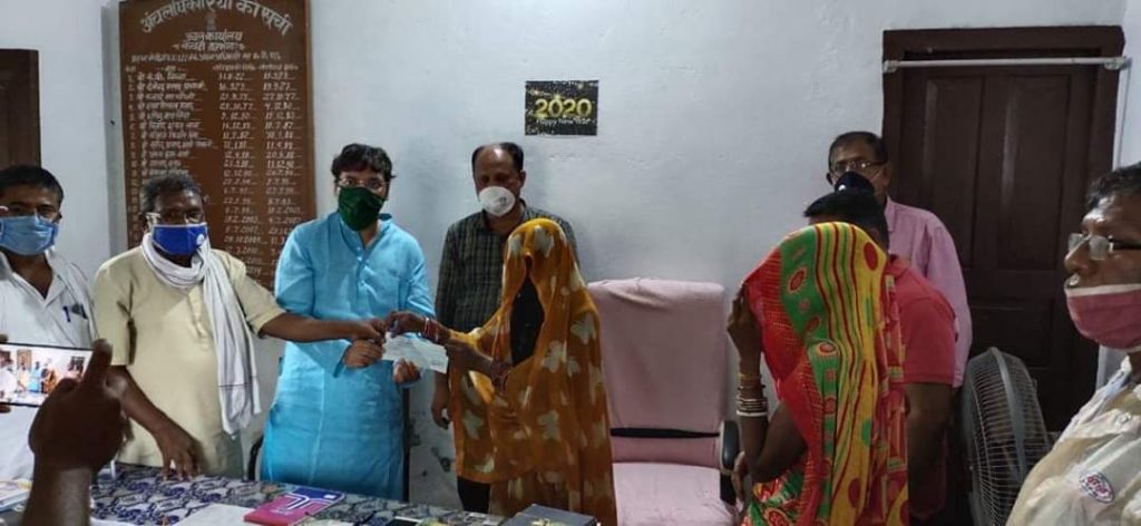 दरभंगा, 19 जुलाई 2020, दरभंगा के केवटी अंचल के तीन मृतक जिनकी मृत्यु पानी में डूबने या बाढ़ के कारण हुई थी। आज केवटी अंचल कार्यालय में केवटी के माननीय विधायक मो0 फराज फातमी द्वारा अनुग्रह अनुदान के रूप में मृतक के परिजनों को 04- 04 लाख रुपये के चेक प्रदान किए गए। जिनमें मृतक 1. स्वo आदित्य कुमार राम, माता- बबीता देवी, पति- विनोद राम ग्राम-पाराड़ीह, पोo-दरिमा, दरभंगा, 2- मृतक विकाश पासवान, माता – रीना देवी, पति- कमलेश पासवान, ग्राम- पचमा, पोo- कोठिया, दरभंगा (बाढ़ के पानी में डूबने से) एवं 3- मृतक भारती कुमारी, पिता- बिंदे यादव, पेo- हुकुमदेव यादव , ग्राम- बाढ़ दीघियार, पो o-समैला लालगंज , दरभंगा शामिल हैं।